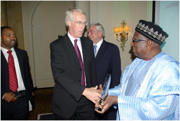 Governor of Abia State His Excellency Chief Theodore Orji and wife receiving African Leadership award from Dr. Ibrahim