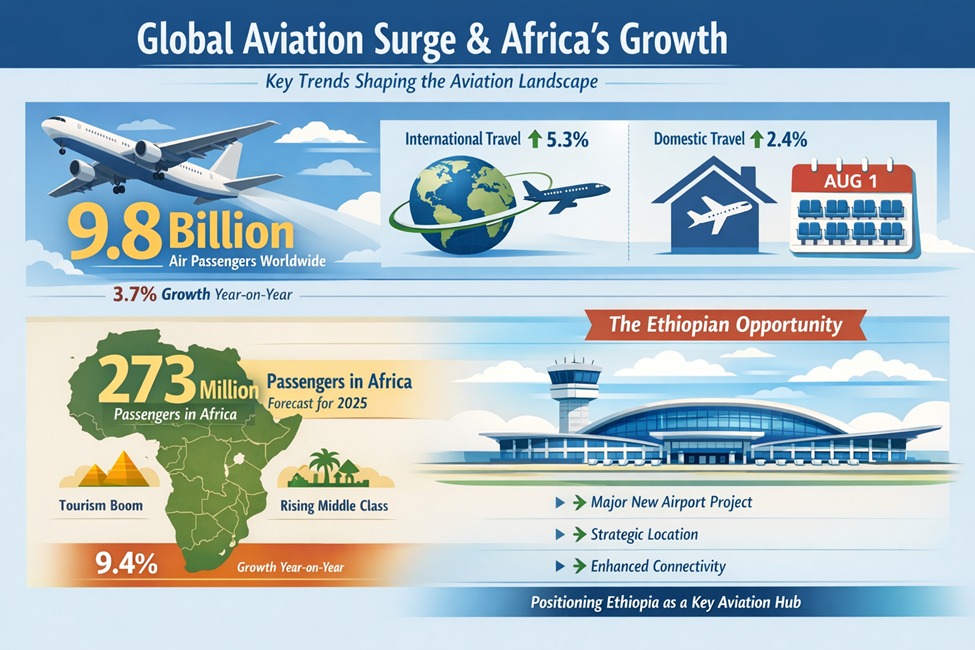 Ethiopia’s airport project must be understood within a wider global aviation context shaped by an unprecedented resurgence in air travel. Worldwide passenger traffic has surged to forecast levels of approximately 9.8 billion travellers, marking one of the strongest rebounds in the history of commercial aviation. This represents a year-on-year growth of about 3.7 per cent, underscoring how decisively global mobility has recovered following the disruption of the COVID-19 pandemic. The scale of this resurgence was symbolically captured when global aviation came close to crossing the ten-billion-passenger threshold, cementing air travel’s return as a cornerstone of global economic activity.